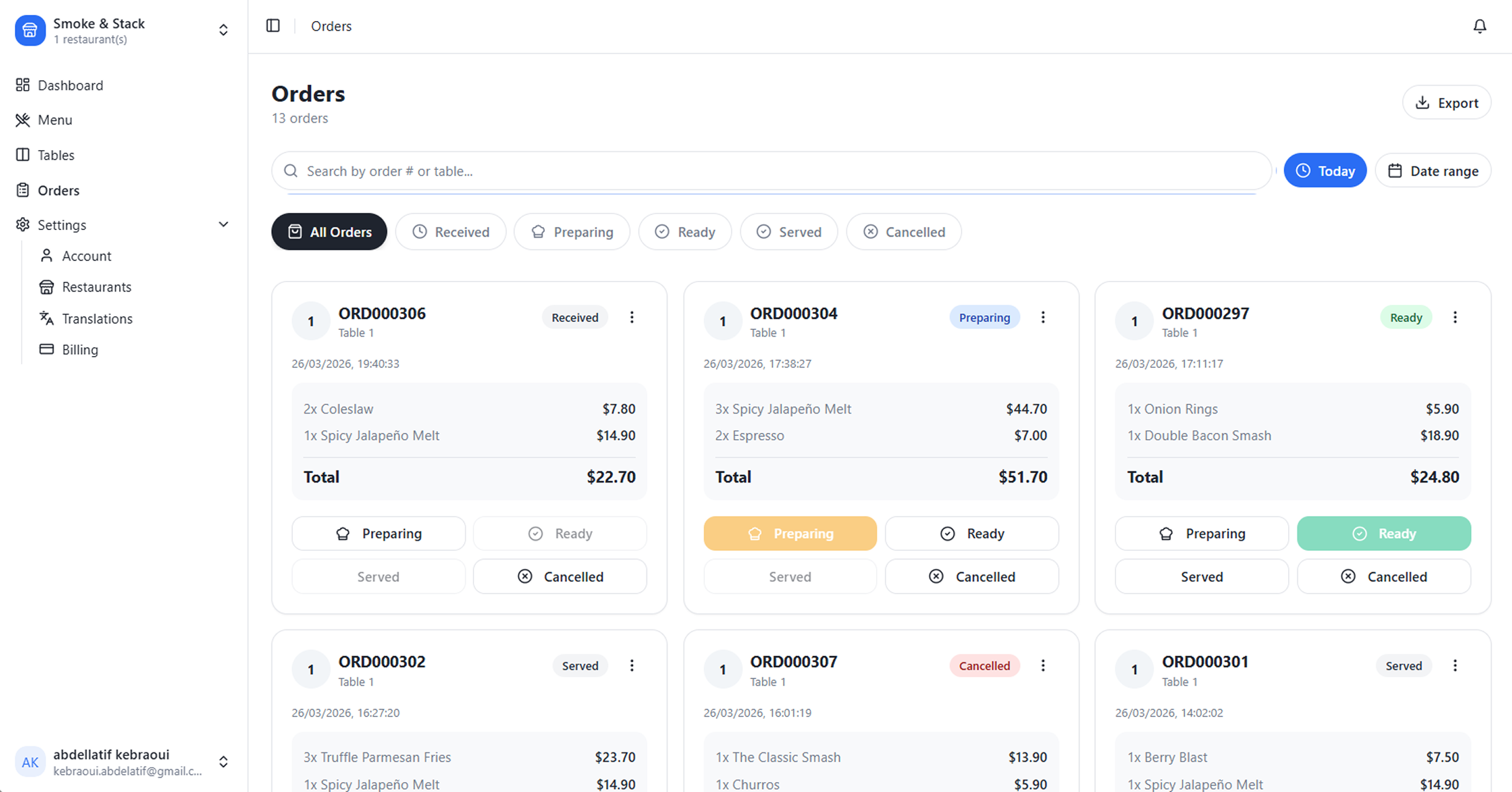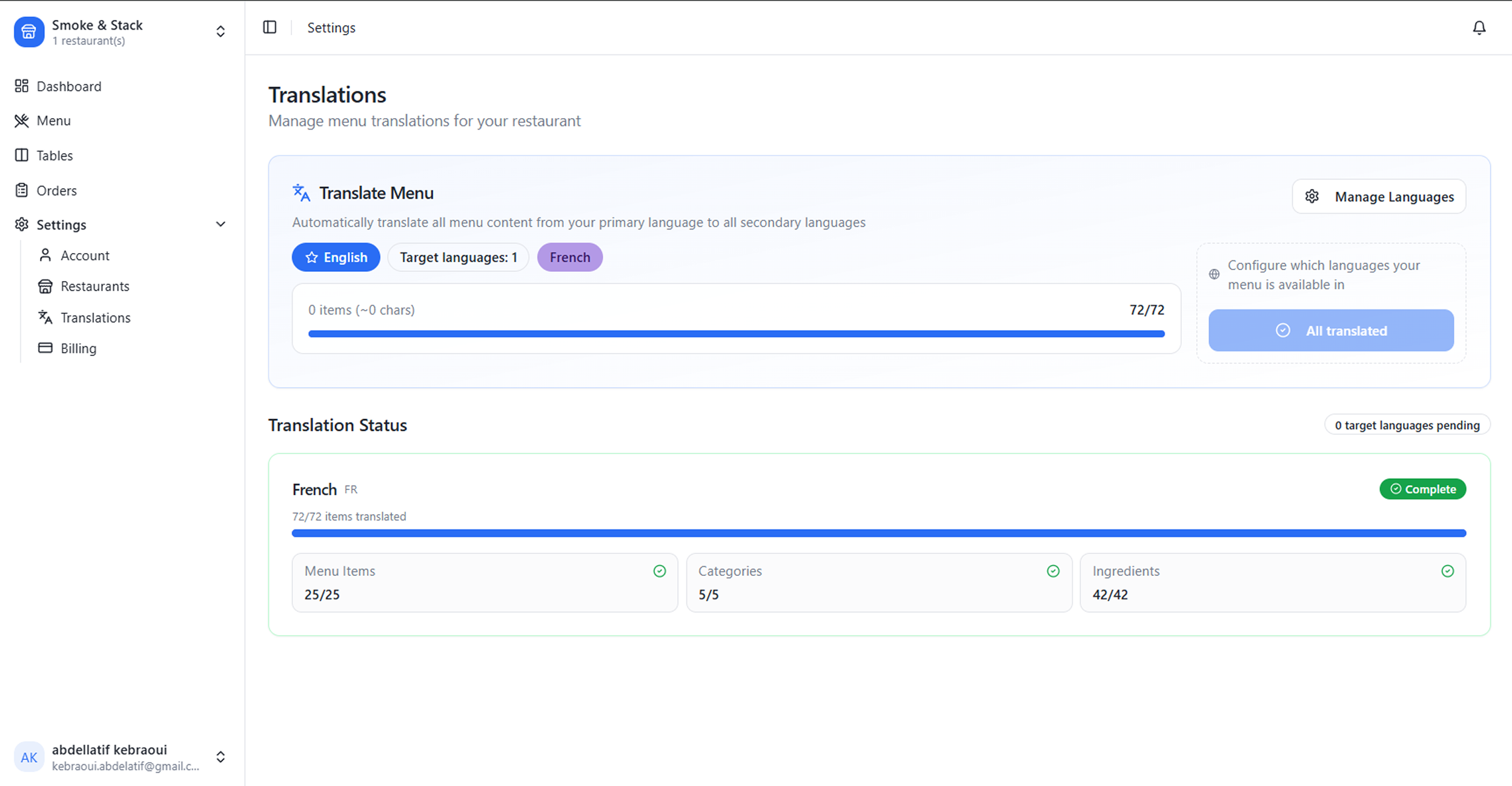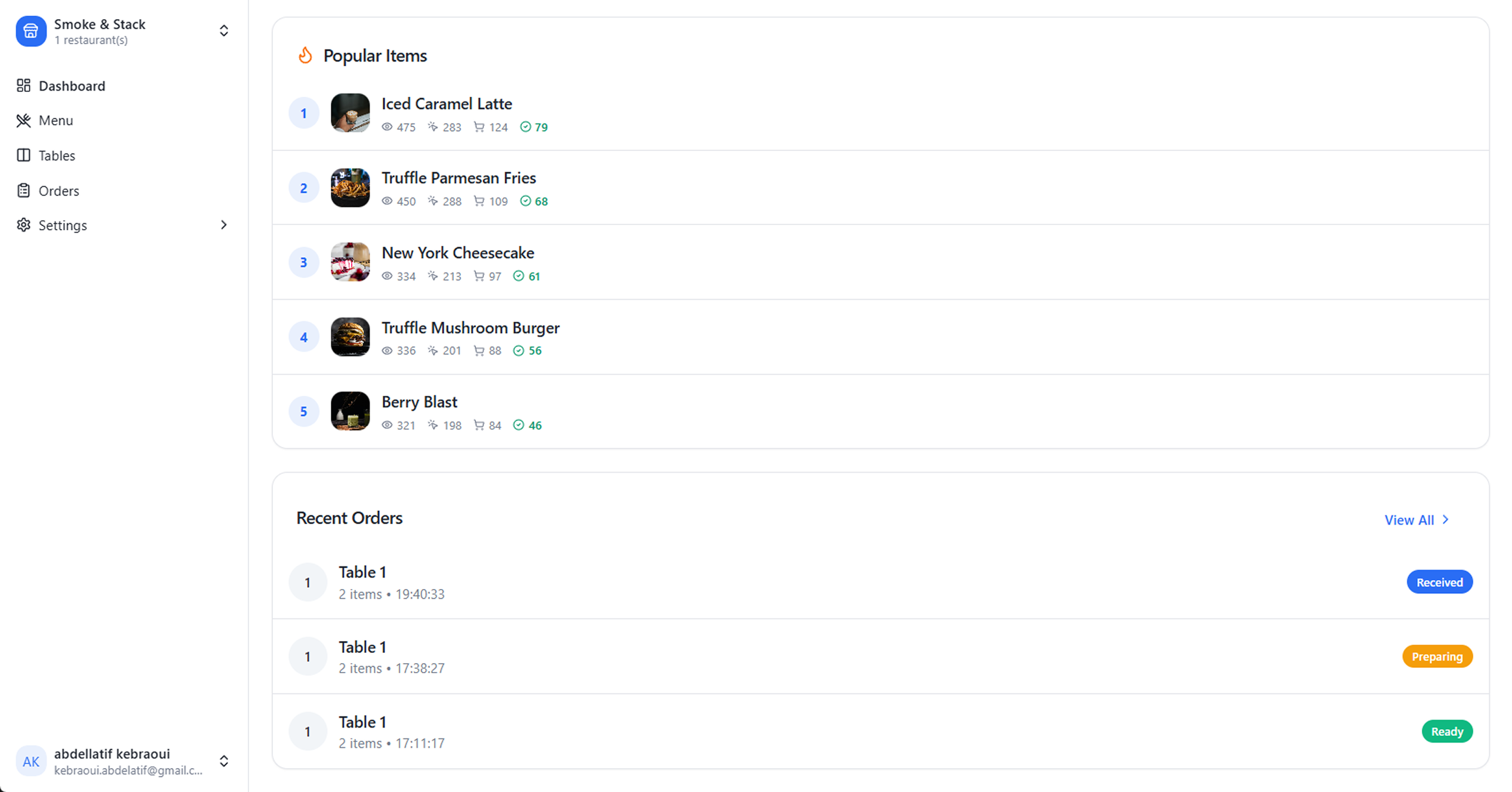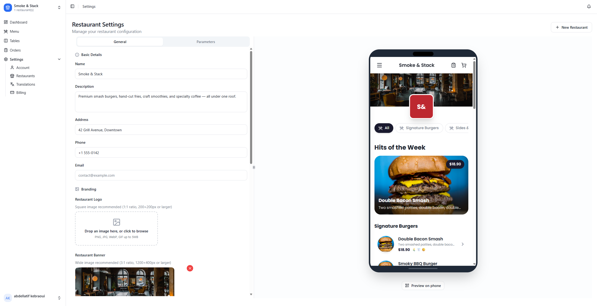- An admin dashboard where restaurant staff manage menus, tables, orders, branding, and translations.