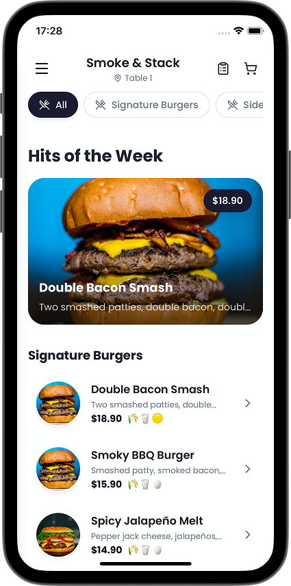 A guest scans a QR code at the table and lands directly on the digital menu. The app validates the QR input, resolves the preferred language, and loads menu data tied to that table and restaurant.